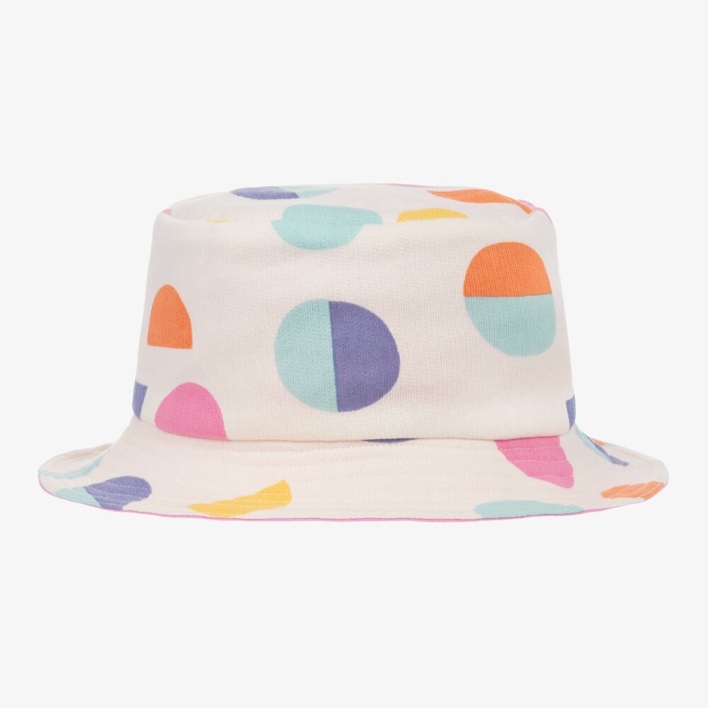 Ivory cotton bucket hat for girls by Joyday, exclusive to Childrensalon. Made in comfortable jersey, it has a colourful circles print and is lined in soft, pink jersey.
