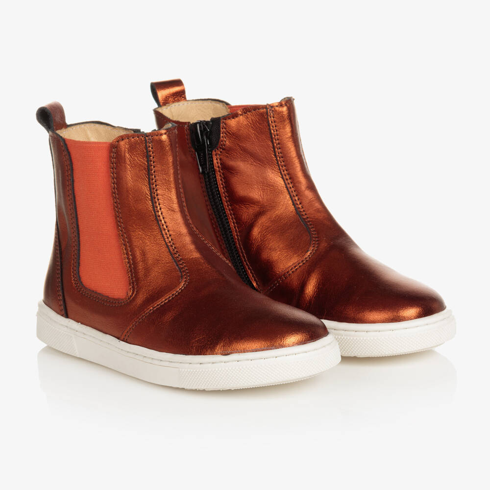 Cool orange leather boots for boys and girls by British brand Joyday, exclusive to Childrensalon. Made in soft, supple leather with a lustrous sheen, they have an orange, elasticated panel on the outer side for comfort and stretch. The lining and insole are made in super soft leather and they fasten with a zip. There is a white, non-slip, rubber sole.