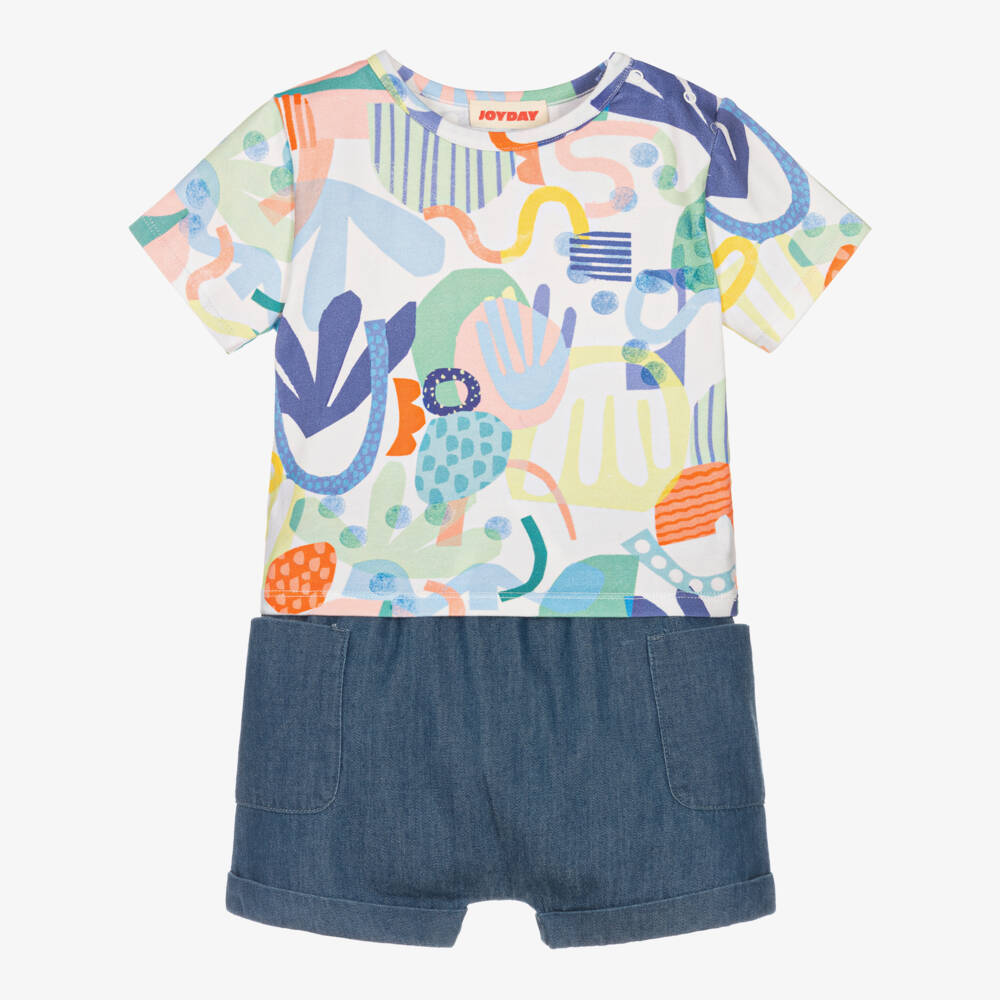 Cute colourful and casual, this cotton shorts set for baby boys and girls is by British brand Joyday is exclusive to Childrensalon. Ideal for relaxed days, the super soft, white jersey T-shirt has a blue and green abstract print, with useful popper fastenings on one shoulder. The blue chambray shorts are full and comfortable, with an elasticated, faux drawstring waist, side patch pockets and fixed turned-up cuffs. Easy to wear, they simply pull up.
