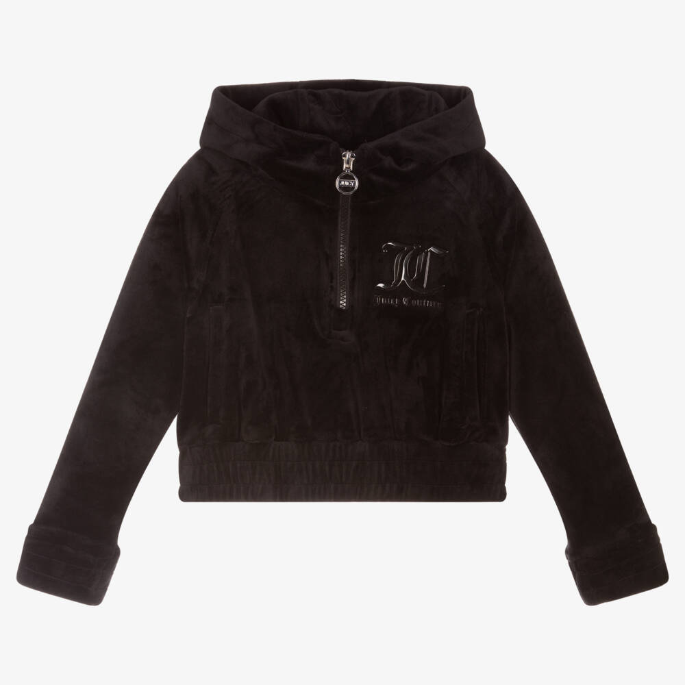 Black hooded top for girls by Juicy Couture, made in super soft velour. In a cropped style, it has a black rubberised logo on one side, front pockets and a wide elasticated waistband. The half-zip fastening on the front has a silver metal logo pull tab.