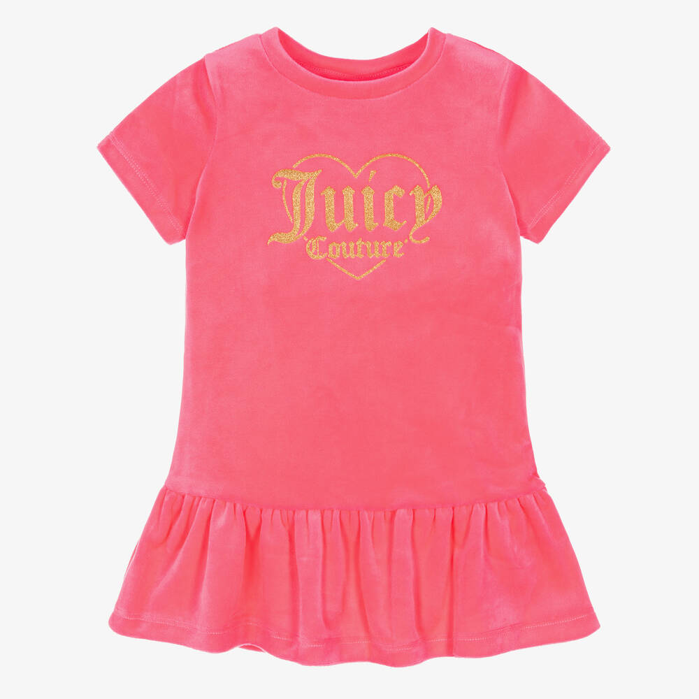Casual and fun bright neon pink dress for younger girls by Juicy Couture, made in super soft and stretchy velour. It has a dropped waist with a ruffle hem and a striking glittery gold logo on the front.