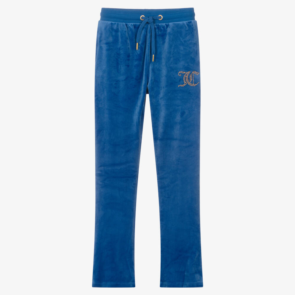 These bright blue joggers for teen girls by Juicy Couture, are designed in a modern flared style. Ideal for relaxing in, they are made in super soft velour, with side seam pockets, patch pockets on the back and a comfortable drawstring waist. For a glamorous finish, a sparkling gold diamanté logo motif is featured on the front, for instant designer recognition.