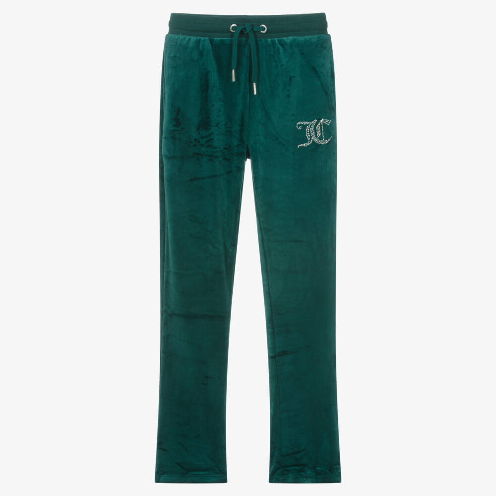 These dark green joggers for teen girls by Juicy Couture, are designed in a modern flared style. Ideal for relaxing in, they are made in super soft velour with side seam pockets, patch pockets on the back and a comfortable drawstring waist. For a glamorous finish, a sparkling silver diamanté logo motif is featured on the front, for instant designer recognition.
