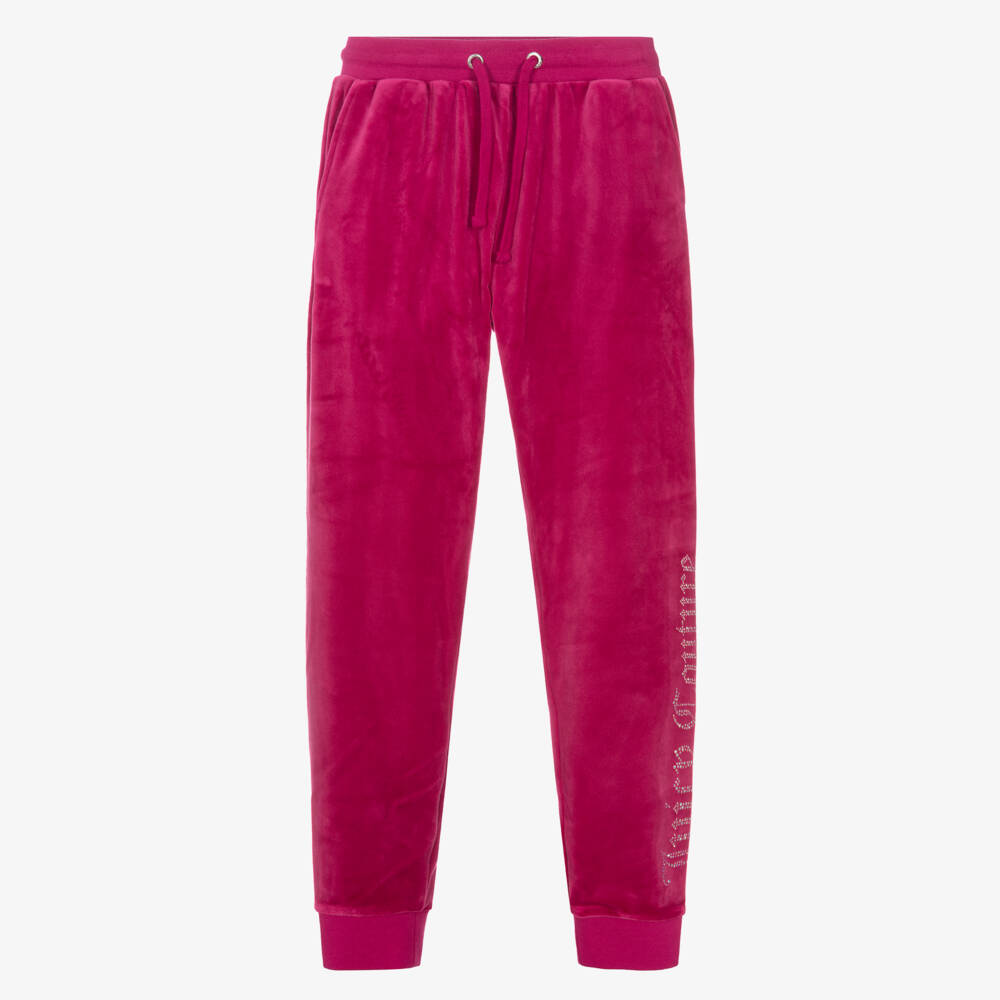 Showcasing an iridescent diamanté logo on one leg, these teen girls chic fuchsia pink slim fit joggers are by Juicy Couture. Made in super soft velour, these lounging joggers have a comfortable elasticated waist with a drawstring, providing a desirable fit. There are useful side pockets and a patch pocket on the back.