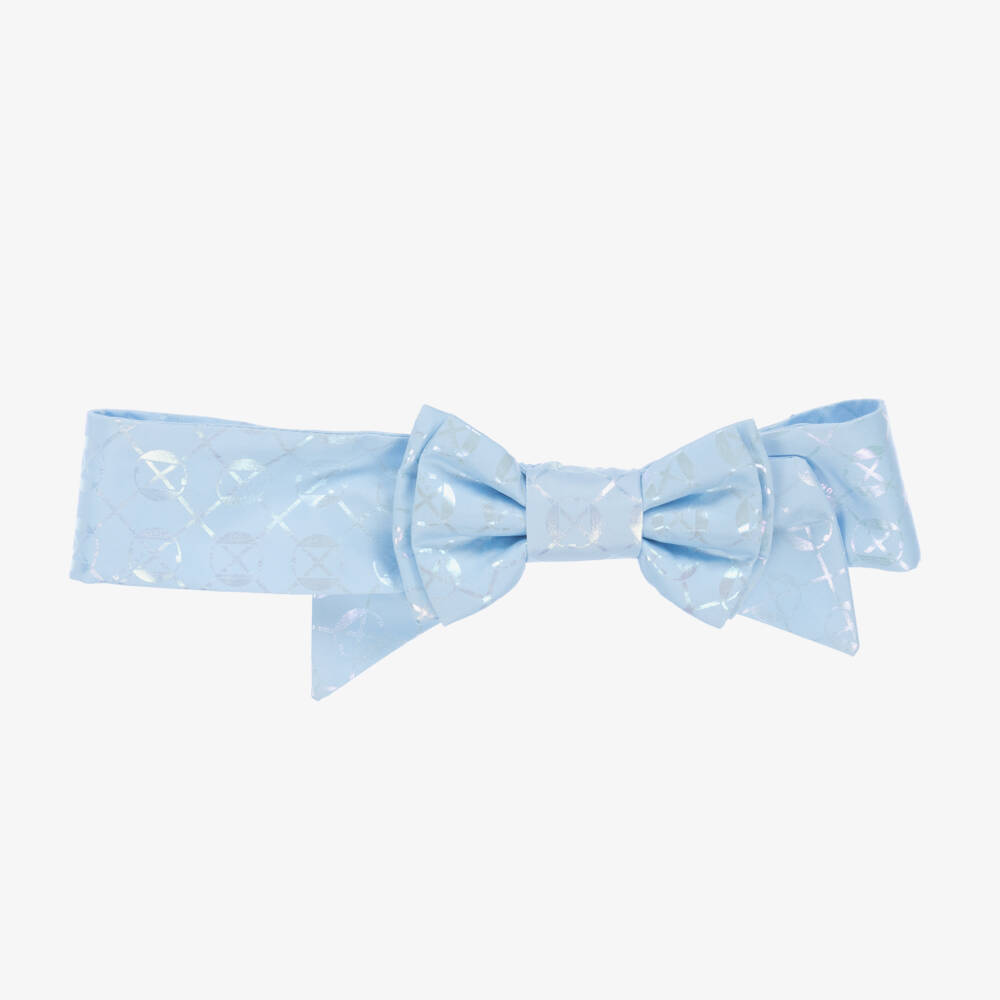 Baby girls pale blue cotton headband by Junona, lovely for accessorizing any cute outfit. Printed with an iridescent logo print all-over, it has an adorable oversized bow on the front and an elasticated trim at the back. The brand's gold logo charm is embroidered on the side for a pretty finishing touch.