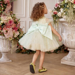 Gorgeous blue special occasion tulle dress for baby girls by Junona, patterned with glittery dots. A detachable statement cape-style collar beautifully decorated with sparkly beads and pearls, and the large bow on the back, add a dramatic finishing touch. Fastening with a concealed back zip, the sleeveless dress has a satin underlayer on the bodice and a lightweight cotton lining for comfort.