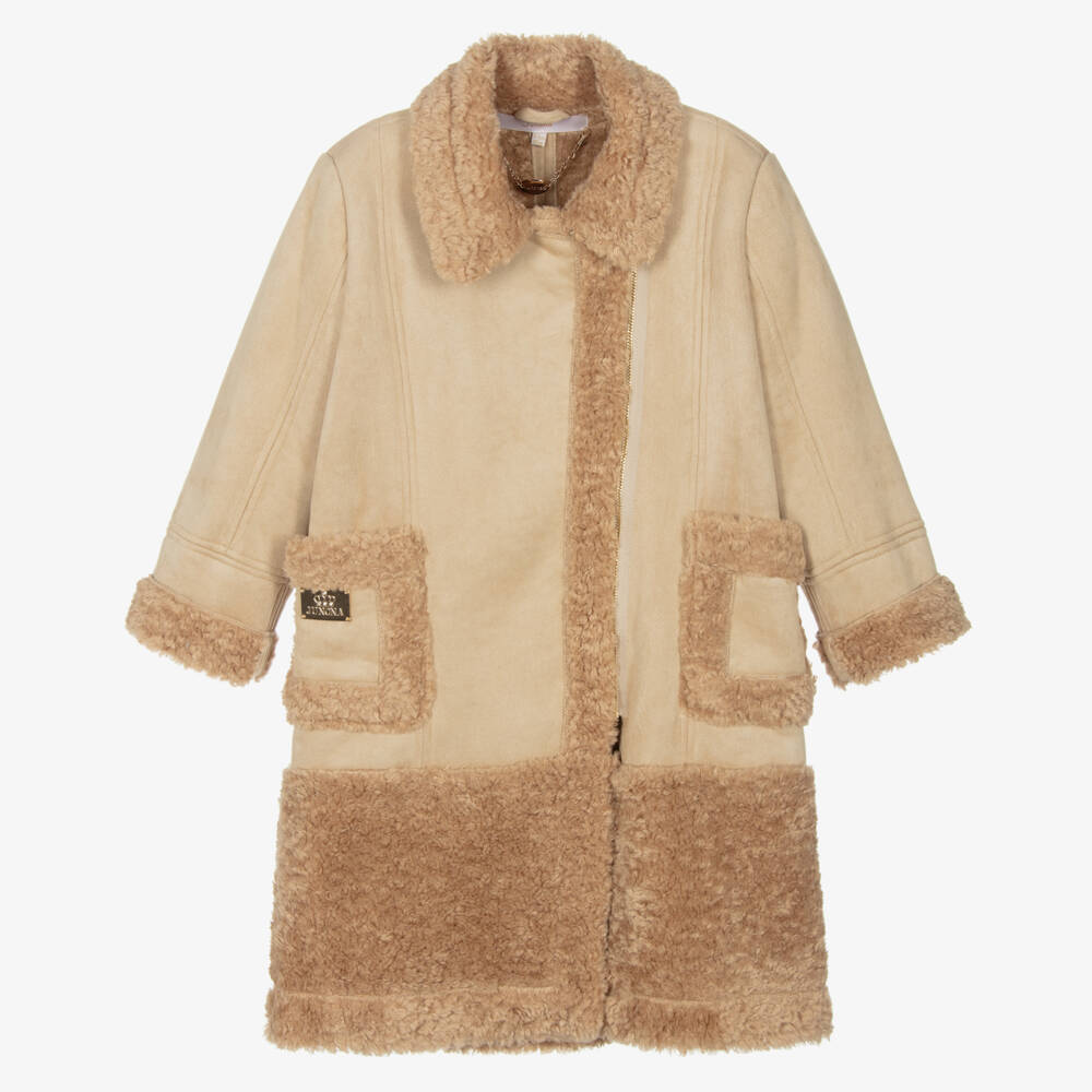 A lovely two-tone beige coat for girls by Junona, made from super soft faux suede. Super stylish, it fastens with an off-centre gold zip on the front and has two large patch pockets, one with a branded gold plaque embellished with diamantés. This cosy coat is lined and trimmed in soft faux shearling.