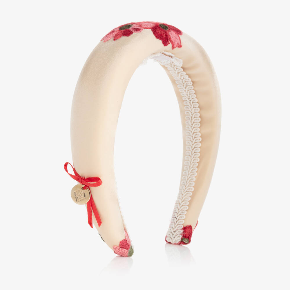 This gorgeous beige padded hairband for girls, by Junona, is a Childrensalon exclusive. Great for adding statement to an outfit, this plush accessory is adorned with pink floral stitching and a red charm logo bow. The flexibility of the band allows for a comfortable fit on the head.