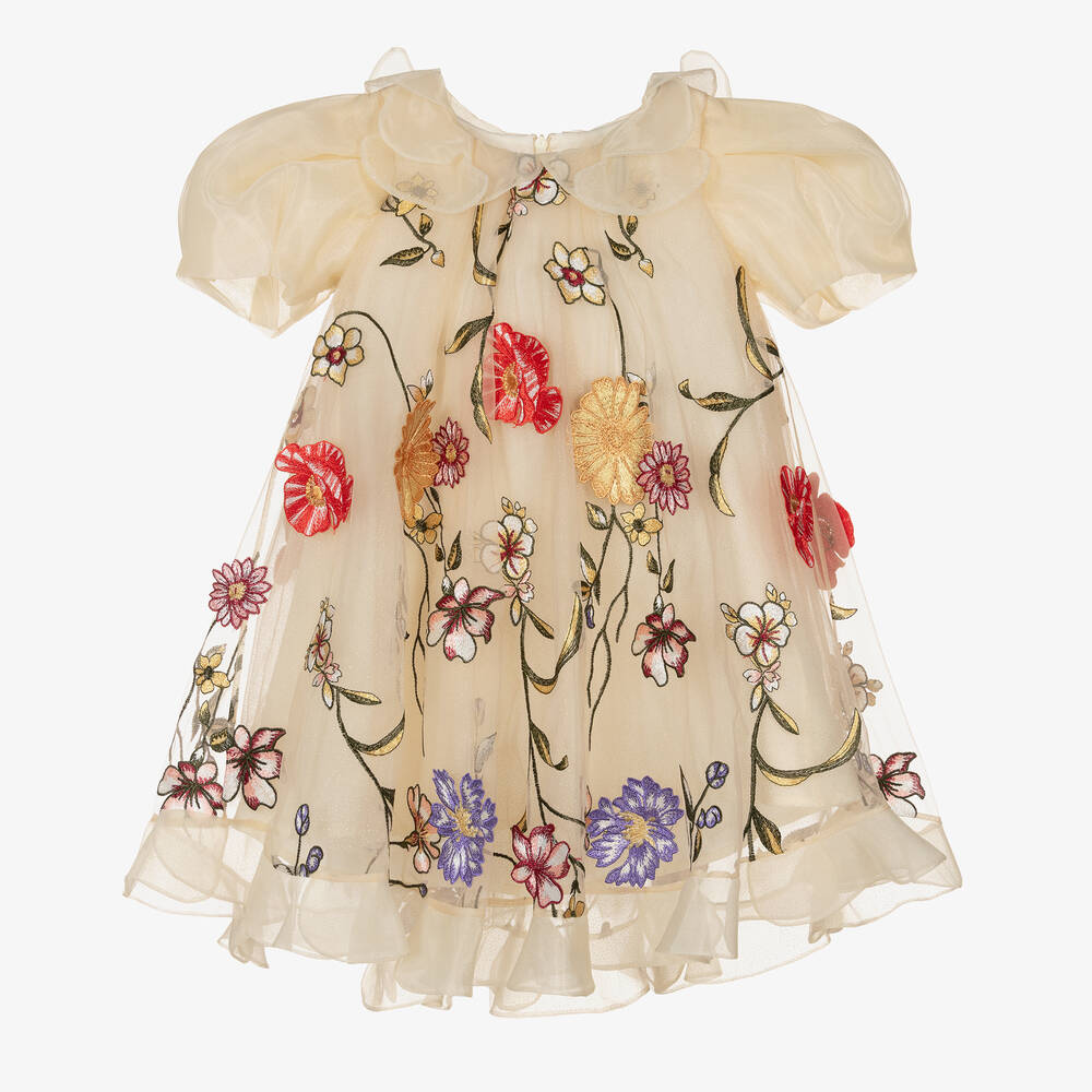 Girls Beige Floral Tulle Dress