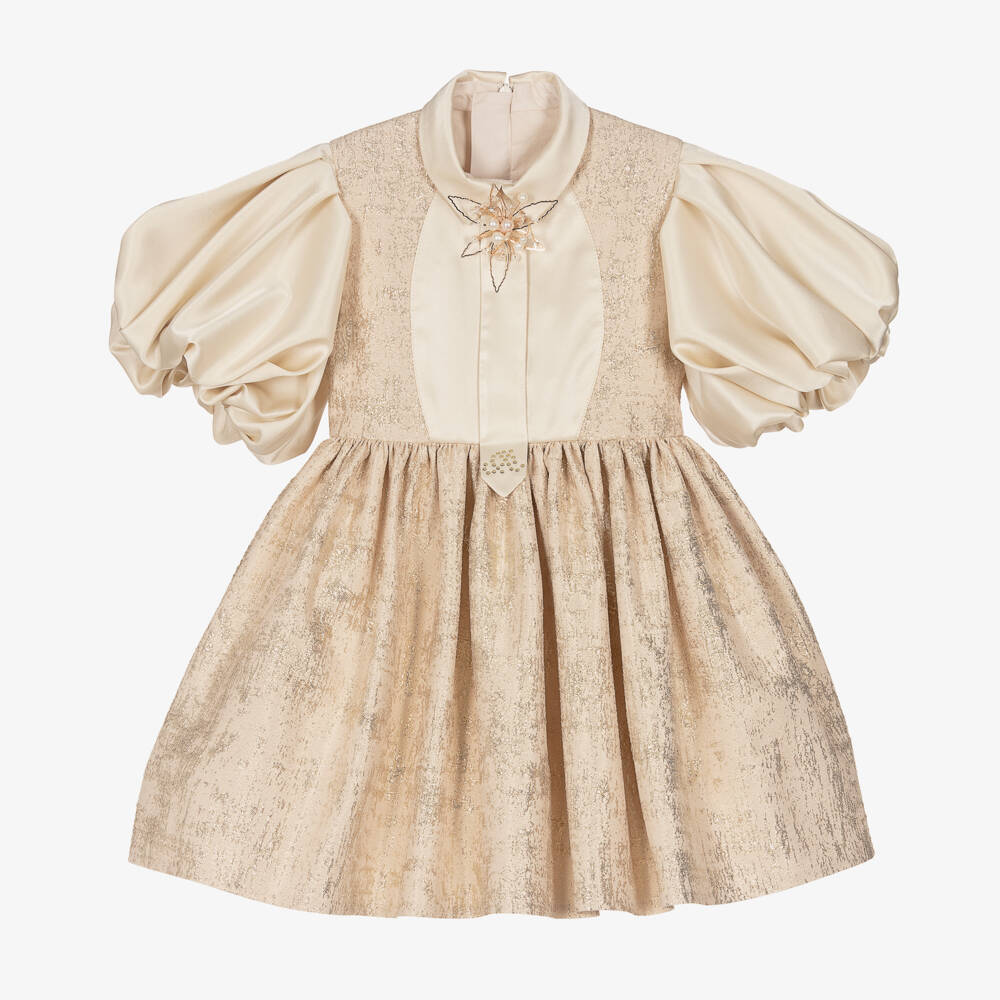 Striking beige jacquard dress for girls by Junona, sparkling with gold thread. The sumptuous satin collar and panel on the front has a fixed tie, embellished with a removable pearl, crystal and gold filigree brooch and a shiny, gold-studded logo. The dramatic, pleated and gathered sleeves are made in coordinating satin, whilst the gathered skirt has a removable, frilled tulle underskirt for extra volume. The dress is fully lined in voile and fastens with a concealed zip around the back for a seamless finish.