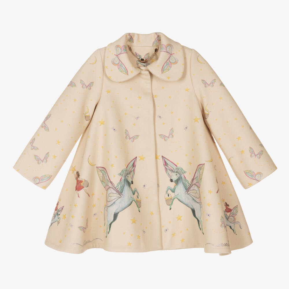 Stunning beige coat for girls from Junona, made in a luxurious wool and cashmere blend. This elegant trapeze style is beautifully patterned with gorgeous unicorns, butterflies and stars in delicate pastel shades and trimmed with iridescent stars for a sparkly touch. The satin lining has a matching unicorn pattern with glitter trim and the coat has concealed popper fastenings trimmed with diamantés to catch the light when the coat is worn open.