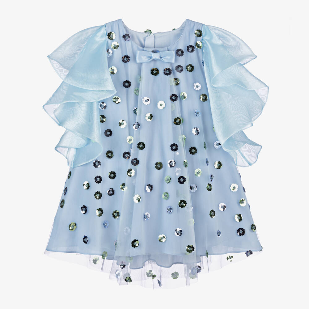 A delightful pale blue special occasion dress for girls by Junona. Made from lightweight tulle embellished with shiny blue and green sequin flowers, it has smooth organza short sleeves in a dramatic waterfall style for a stand-out look. With a floaty trapeze shape, it is lined in soft cotton with underlayers of crêpe and tulle for added volume. Finished with a charming bow decoration on the round neckline, it fastens neatly with a concealed zip on the back.