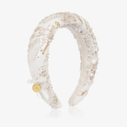 This stunning red burgundy hairband for girls by Junona will add a touch of elegance to her special occasion. outfit. The softly padded flexible band is covered in shimmering sequins and topped with a gorgeous velvet bow, with a gold-tone branded charm to finish.