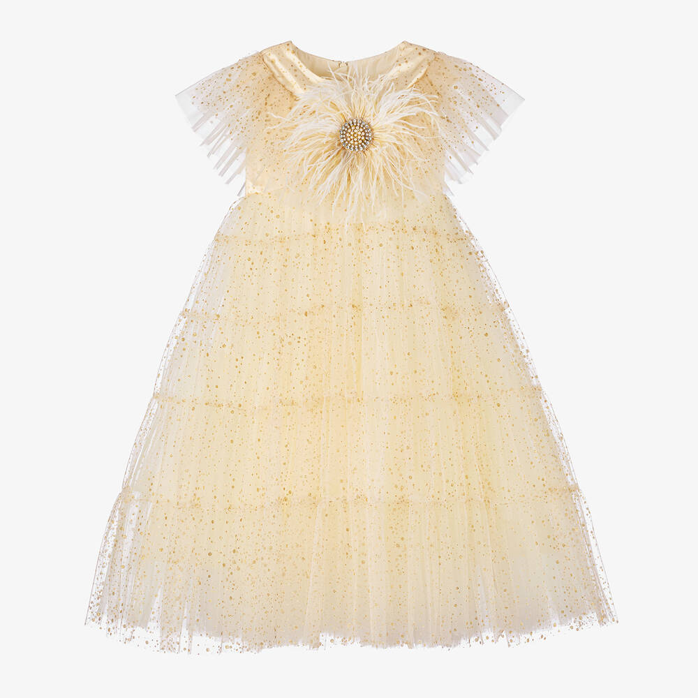 Enchantingly elegant, this golden ivory special occasion dress for girls is by Junona. The beautiful and voluminous silhouette is defined by layers of soft tulle with shimmering gold speckles, delicate organza trim and a hint of silky satin on the bodice. Oversized ruffles and a detachable, statement brooch decorated with sparkly rhinestones, faux pearl and feathers complete the gorgeous look. This sleeveless style is cotton-lined for comfort and fastens with a concealed back zip.