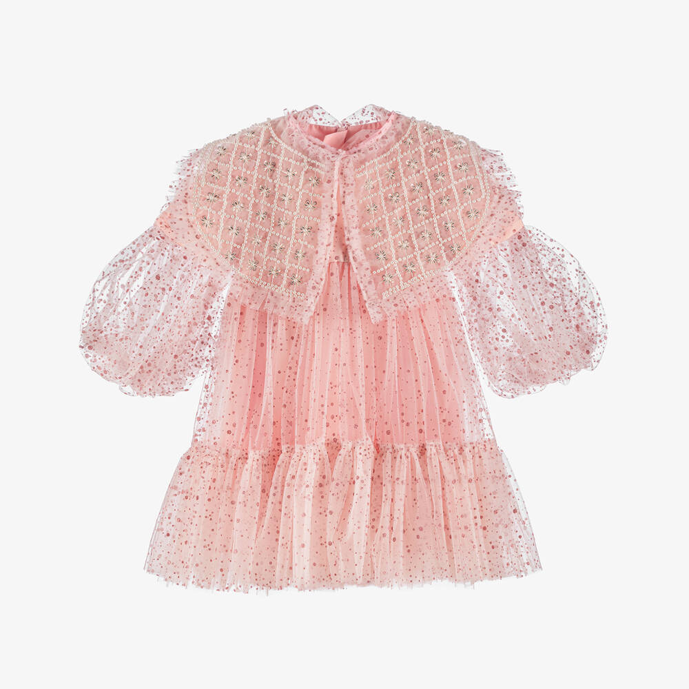 Striking pink special occasion dress for girls by Junona, patterned with glittery dots. Made in lightweight tulle, it has full, gathered sleeves and a deep frill around the skirt, with tulle underskirts for extra volume. It comes with a sheer tulle cape embellished with silver and pearl beads, and shimmering with sequins.