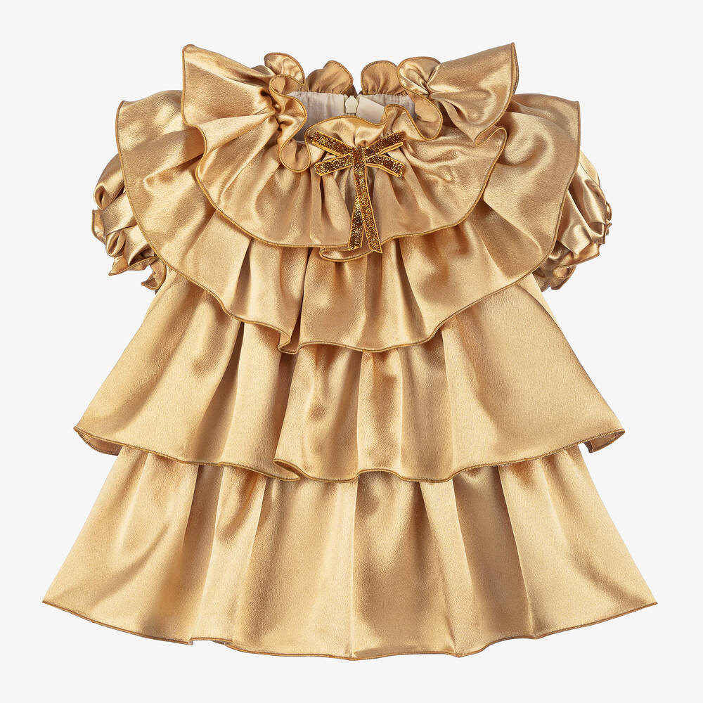 Stunning dress for little girls by Junona, made in glistening gold satin and ideal for any special occasion. It has elaborate, tiered ruffles around the neckline, with a fixed, glittery gold bow on the front, and more tiers on the skirt. The frilly sleeves are short and puffed, and there is a lightweight cotton voile lining for comfort. The dress fastens with a discreet, concealed zip on the back.