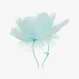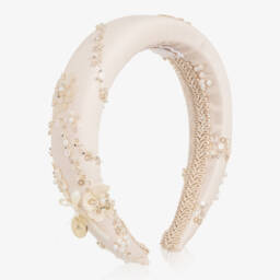 An elegant ivory hairband for girls by Junona. The flexible band is covered with embroidered tulle fabric and one side is adorned with beads and feathers for an eye-catching finish.