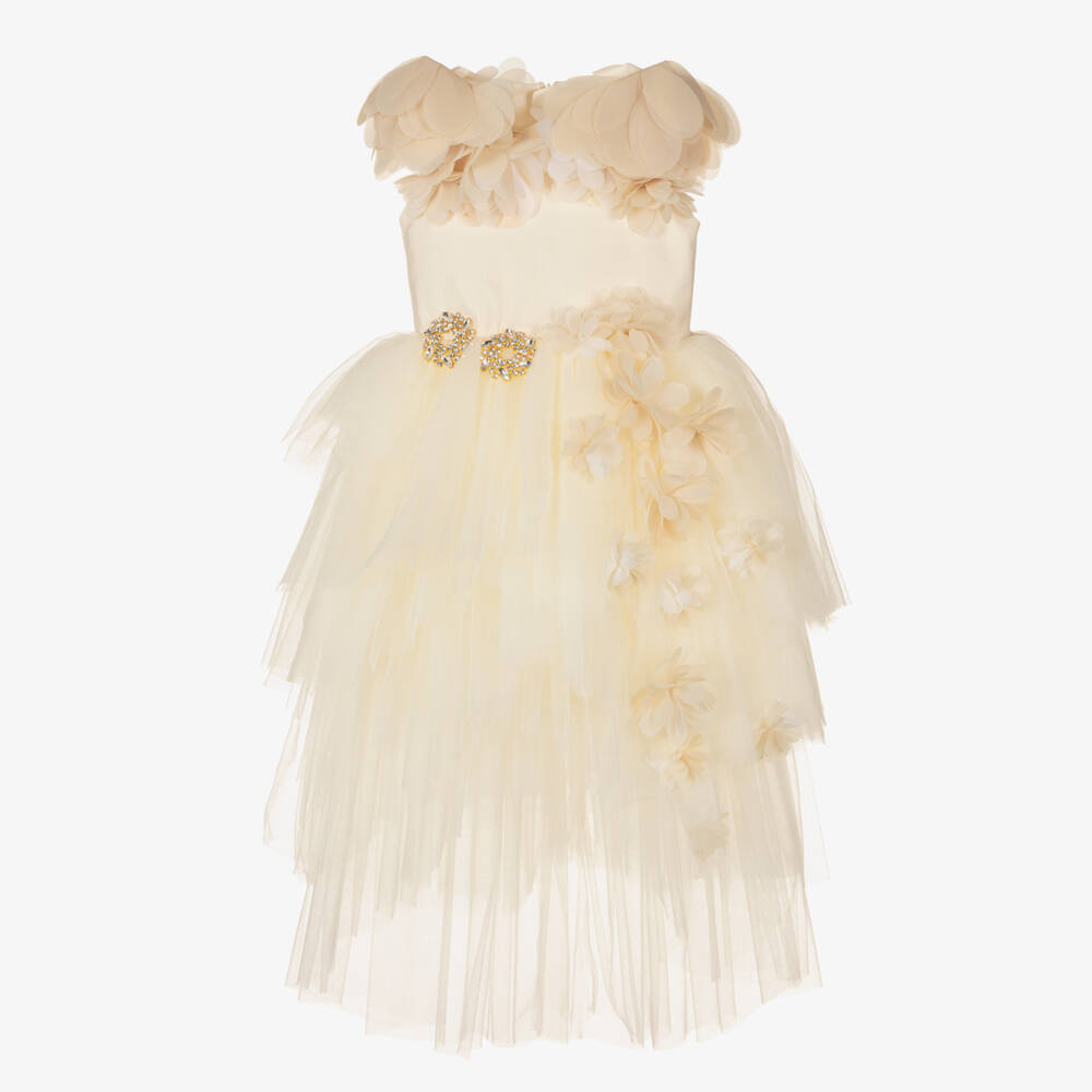 Gorgeous beige and ivory organza petals add a charming finish to this beautiful fine tulle dress for girls by Junona. Exclusive to Childrensalon, this elegant design has a lovely gradient effect that fades from dark ivory on the fitted bodice to pale ivory on the skirt. The high-low hem skirt falls in gathered tiers with cascading organza flowers and diamanté jewelled decorations on the waist for a glamorous finish. Comfortably lined in lightweight cotton, tulle underlayers add volume to the feminine silhouette and the dress fastens with a concealed zip on the back.