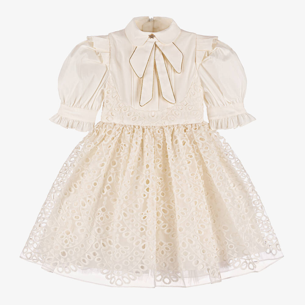 An elegant ivory special occasion dress for girls by Junona. Made from a smooth cotton-blended weave, the bodice has a sweet rounded collar on the high neckline with a gold piped bow detail and diamanté butterfly embellishment. There are pintuck pleats on the chest, ruffles on the shoulders, and puffed short sleeves with frilled cuffs and gold button fastenings. The voluminous skirt made with underlayers of tulle has an organza overlayer with an embroidered cutwork pattern for added charm. Lined in a lightweight cotton, it fastens with a concealed zip on the back.