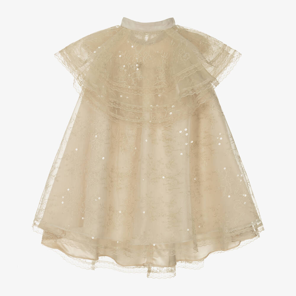 A lovely, dark ivory special occasion tulle dress for girls by Junona, detailed with shimmering gold floral embroidery and sparkling diamantés. Draping elegantly from the neckline, the dress is lined in lightweight organza and silky satin, with a soft cotton lining for ultimate comfort. Trimmed in delicate lace, it is detailed on the front with a beautiful crystal heart and bow, with a concealed zip on the back adding a neat finish. To complete the look, it comes with a matching, tiered cape that fastens with golden buttons.
