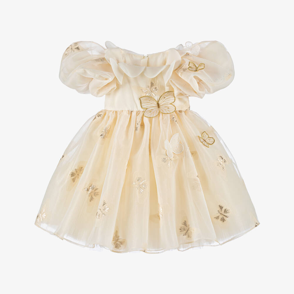 Stunning ivory organza dress for girls from Junona, with a shimmery gold jacquard butterfly pattern. The special occasion look is defined by dramatic puffed sleeves and a lovely petal-style neckline, with 3D embroidered butterflies adding a beautiful couture touch. Layers of tulle underneath the skirt give the dress a floaty and voluminous silhouette.