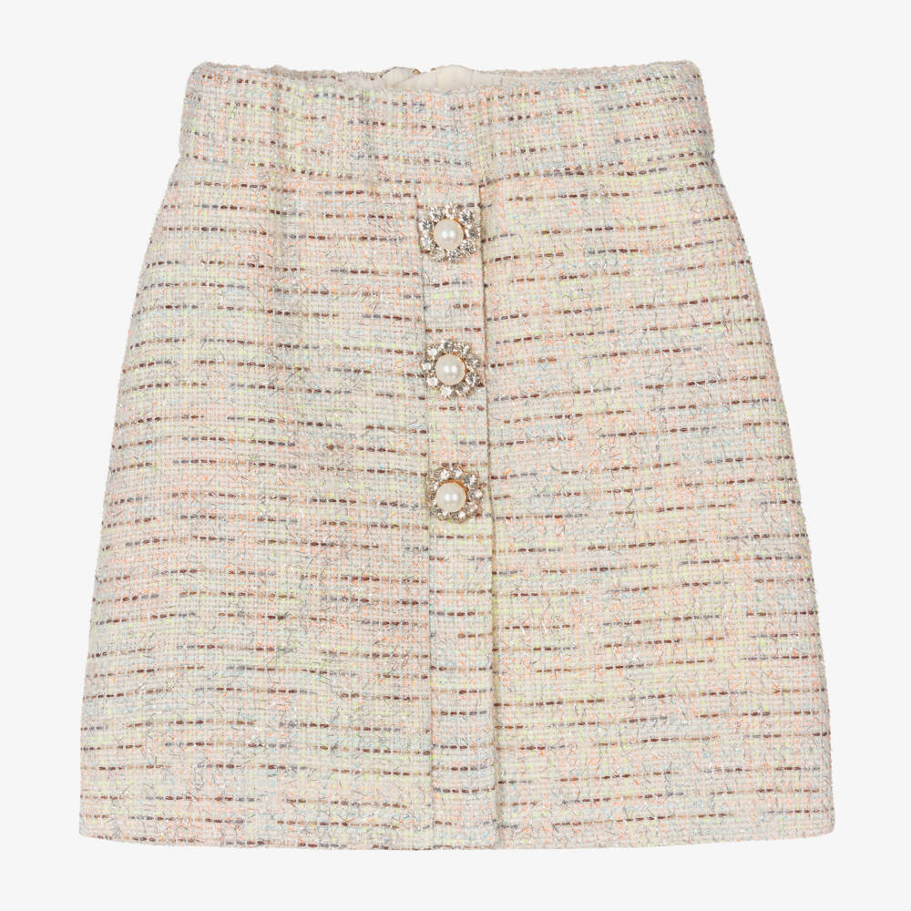 Stylish ivory skirt for girls from Junona, woven with sparkly silver and neon threads in green and orange for an eye-catching look. Ideal for smart occasions, it has a faux opening on the front with decorative crystal and pearl buttons for a glamorous touch. It is comfortably lined in lightweight cotton and has a gently elasticated waistband with a gold metal zip fastening on the back.