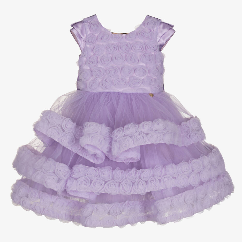 Stunning lilac purple tulle dress for girls by Junona, embellished with floral appliqués and a golden heart logo charm on the waist. The sumptuous satin bodice has layered, capped sleeves and collar detailing around the back, with an oversized, detachable satin bow, secured with poppers. The voluminous, tiered tulle skirt has layers of tulle ruffles below, creating a statement dress ideal for any special occasion. Fully lined in voile for comfort, it fastens with a concealed zip for a seamless look.