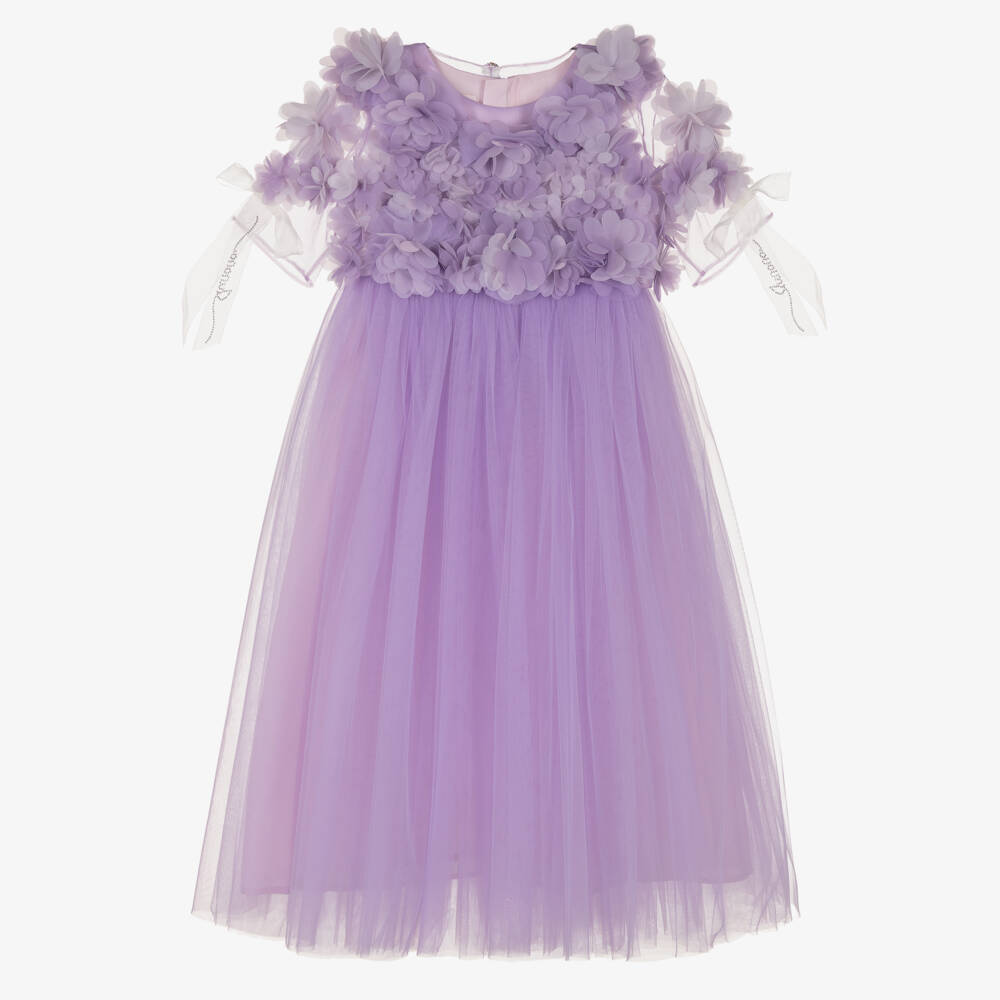 Simply stunning, a lilac purple two-piece tulle special occasion dress for girls by Junona, an exclusive to Childrensalon. A gorgeous, tulle bolero covered in 3D flowers can be worn over the dress for a more formal and refined look. It fastens with a row of shiny metallic buttons on the back, and has a white organza bow detail on the sheer sleeves with sparkly diamanté for a subtly branded feel. Understated and elegant, the sleeveless dress has a satin-lined bodice and a gracefully flared, floor-length skirt created from generous layers of soft tulle. Fully lined in soft voile, it fastens with an invisible zip on the back for a seamless look. A statement bow attached with poppers on the back, gives it a lovely finishing touch.