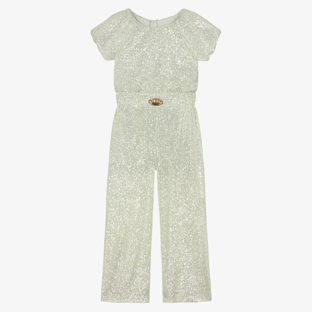 Mint green jumpsuit for girls by Junona, decorated with shimmering sequins. Ideal for special occasions, this sparkly outfit is soft and stretchy and has an elasticated waistband and puffed short sleeves. The brand's gold logo badge is sewn on the front and there is a concealed zip fastening on the back and it fully lined in soft jersey for comfort.