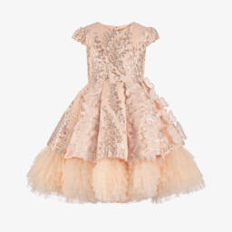 Gorgeous navy blue dress for girls by Junona, made in a soft chiffon with layers of soft tulle for added volume. This stunning dress has a shimmering foil effect floral print and an oversized white lace collar with pretty diamanté detailing. It has balloon sleeves with ruched detailing at the top and on the bodice and a fully gathered skirt with a frilled hem. Beautifully finished with a sparkling pink bow on the front, it fastens at the back with a concealed zip.