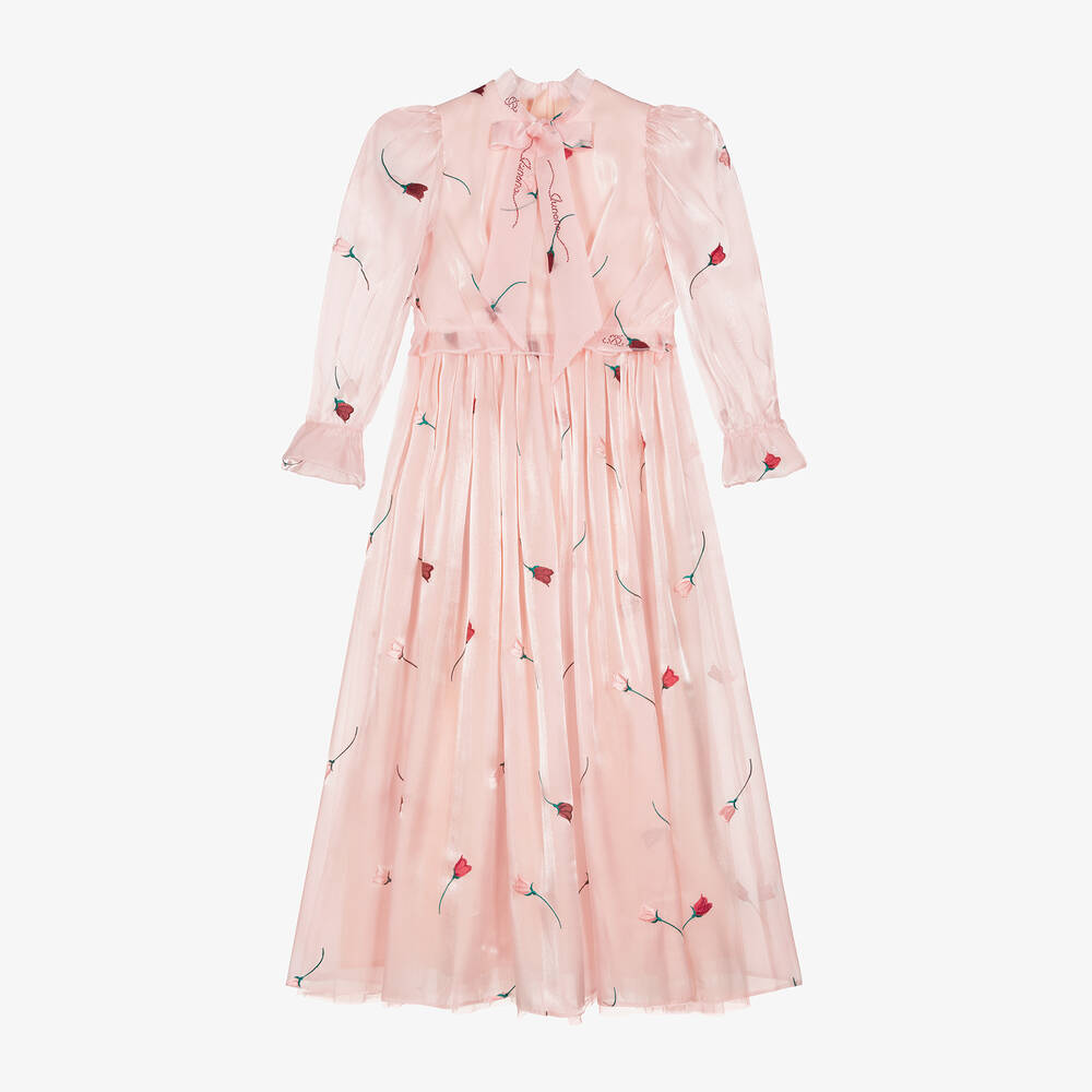 A beautiful light pink dress for older girls by Junona, made in silky smooth chiffon organza to create a floaty silhouette. Lovely for a special occasion, this ankle-length dress is intricately embroidered with pink and red tulips for a romantic feel. Tie fastenings on the neckline are detailed with pretty red diamantés which spell out the designer's name. The semi-sheer sleeves, which gather on the shoulder, are elasticated on the cuff. The waistline is trimmed with a subtle ruffle and a concealed zip fastening neatly secures on the back. Underneath, the comfortable cotton lining is layered with lightweight tulle from the waist down.