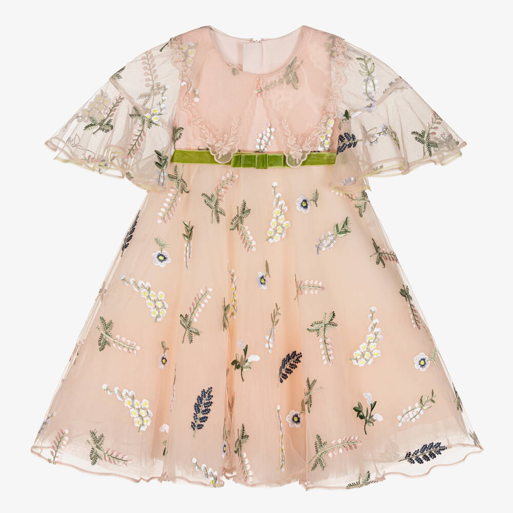 A pale dusky pink special occasion tulle dress for girls by Junona. Beautifully embroidered flowers in a subtle colour palette can be seen throughout the design. For a romantic silhouette, it features an organza collar with tonal embroidery and beautifully ruffled tulle sleeves with diamanté logo for a touch of sparkle. Removable with an intricate golden logo clasp buckle, the green velvet bow belt gives it a contrasting finishing touch. It is lined in soft cotton for optimum comfort and fasten with an invisible back zip.