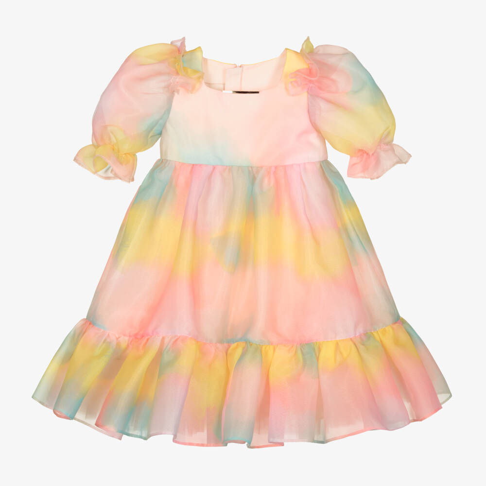 Girls luxurious pink, blue and yellow dress by Junona, exclusive to Childrensalon. It is made in lightweight organza, with a beautiful watercolour effect. The puffed sleeves have ruffle trims and may be worn on or off the shoulders. There is a pink tulle petticoat that adds volume to the skirt and a lightweight cotton lining for comfort. Gold metal detail decorates the square neckline and there is a concealed zip on the back to fasten.