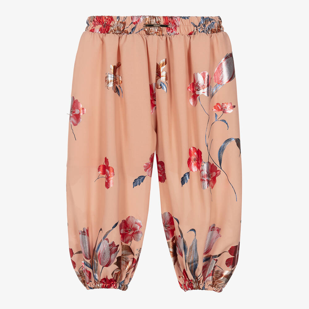 Dusky pink trousers for girls by Junona, lovely for special occasions. Patterned in a bold, pink and red metallic floral print, they are made in luxuriously soft chiffon for an elegant, floaty look. They have an elasticated waist and elasticated cuffs for comfort and style. An embossed gold logo charm finishes these unique trousers with a branded touch.