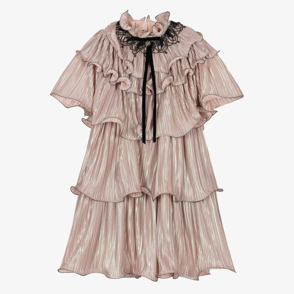 Shimmering pink plissé dress for girls by Junona. Layers of ruffles cascade from the neck to create a dramatic tiered look on the stunning special occasion dress. A lacy black collar, velvet ribbon bow and gold logo charm, gives it an elegant finish. Soft and lightweight, it is lined in cotton voile for comfort and fastens neatly at the back with a concealed zip.