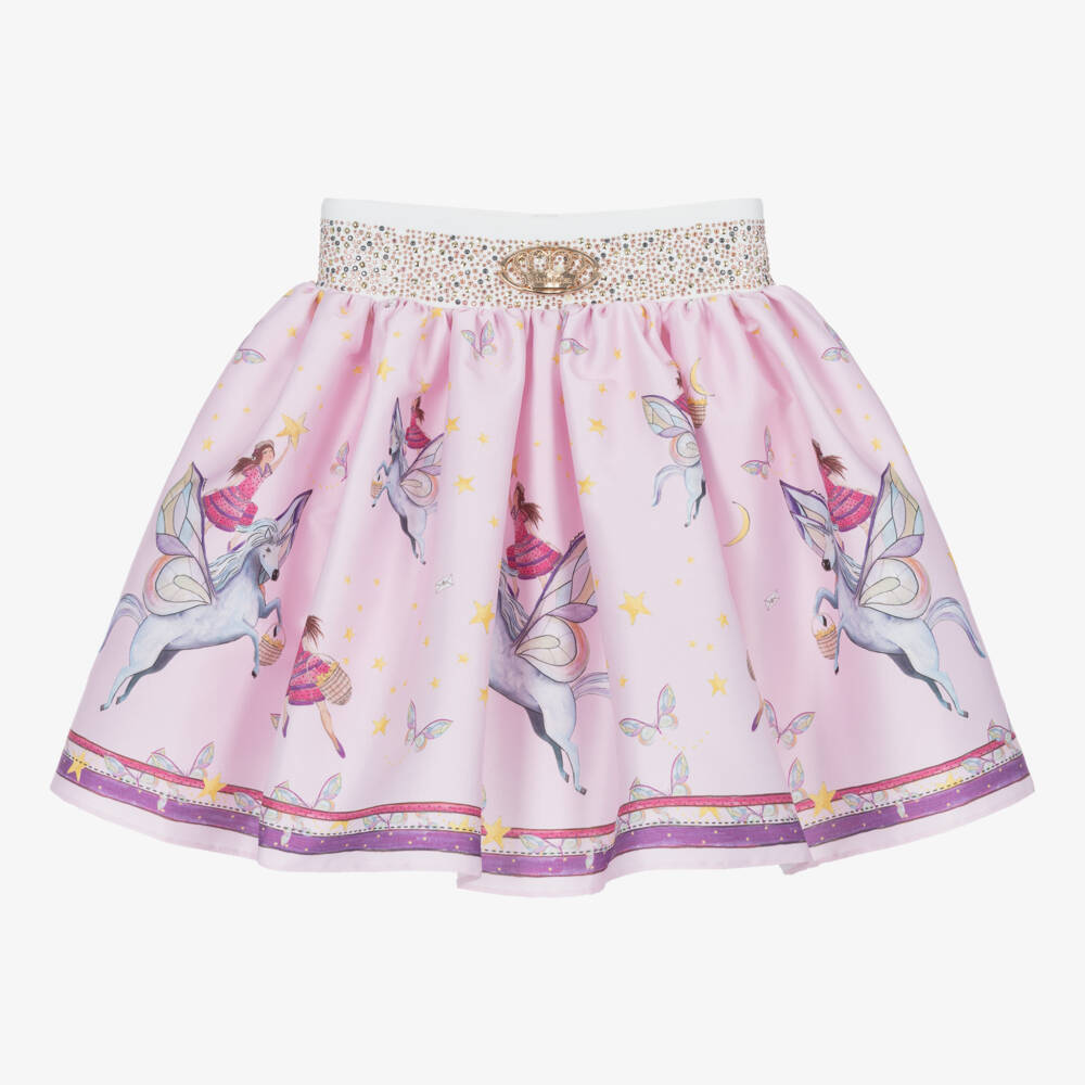 Gorgeous pink satin skirt for girls by Junona, lined with layers of soft tulle to give volume and a pretty silhouette. It is patterned with a magical flying unicorn print and has a diamanté encrusted elasticated waistband. Fully lined in lightweight cotton voile for comfort, it has a signature gold metal logo plate on the front giving it a distinctive designer finish.