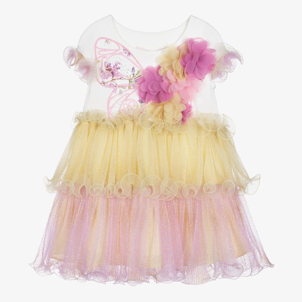Eye-catching pink and yellow dress for girls by Junona, made of a cotton jersey top and layered tulle skirt. The white top has a butterfly embroidered on the front, one half of which is embellished with diamantés and the other has 3D chiffon flowers for a pretty finish. The skirt is layered tulle with curly edges for a fashion-forward silhouette and to match the sleeve detailing.