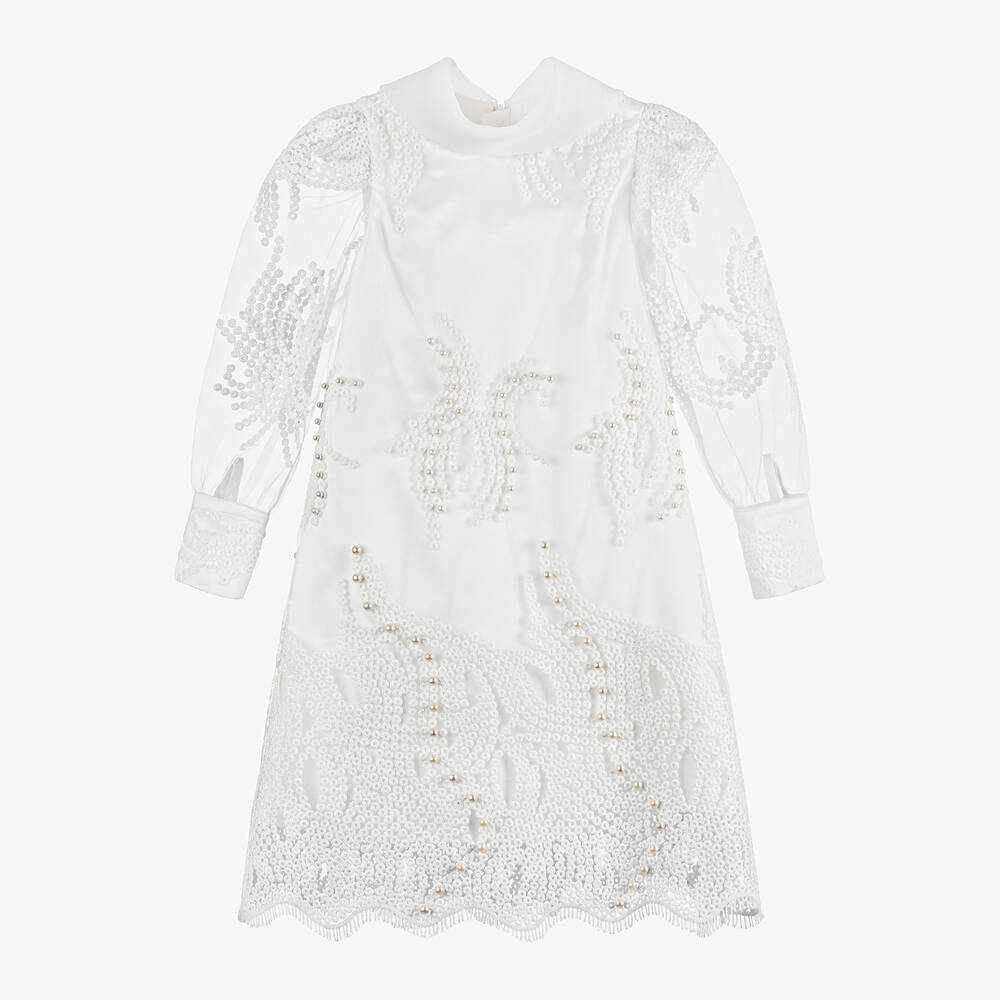 An elegant white special occasion dress for girls by Junona. In a stylish A-line silhouette, it is made from smooth satin with an embroidered tulle overlayer that is embellished with faux pearls and shimmery transparent sequins. The sheer long sleeves have wide cuffs with gold buttons and there is a sophisticated rolled collar for a chic look. Lined in soft cotton, it fastens with a concealed zip on the back for a discreet finish.
