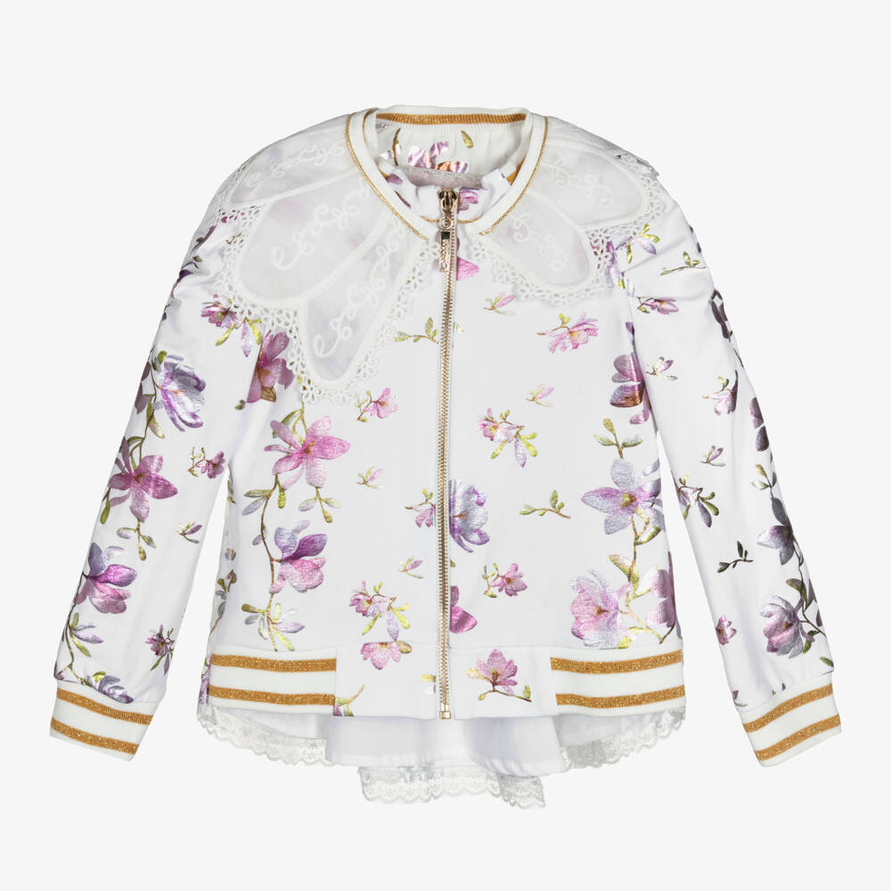 Eye-catching white cotton jacket for girls by Junona, with a shiny lilac purple and green floral print and gold piping. Made in lightweight jersey on the front, it has gathered, puffed sleeves, ribbed trims striped in glittery gold, and a detachable, asymmetrical, embroidered voile collar. Around the back it is made in lightweight, gathered voile with a feminine, lace-trimmed, tulle overlay. It has an exposed gold zip fastening on the front with a logo pull tab, and a gold metal logo plate around the back.