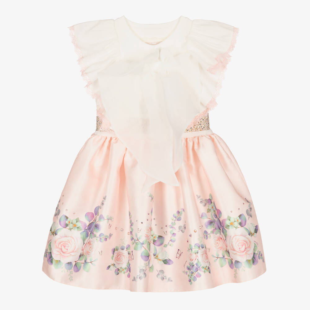 Charming white and pink dress for girls by Junona, with a comfortable cotton jersey top and silky satin skirt. It has pretty flutter sleeves trimmed in pale pink lace and an oversized chiffon bow on the chest for a feminine finish. The waist is embellished with rhinestones giving the effect of a belt. The pink skirt is printed with a beautiful floral print with diamantés for a touch of sparkle and is layered over tulle to create volume.