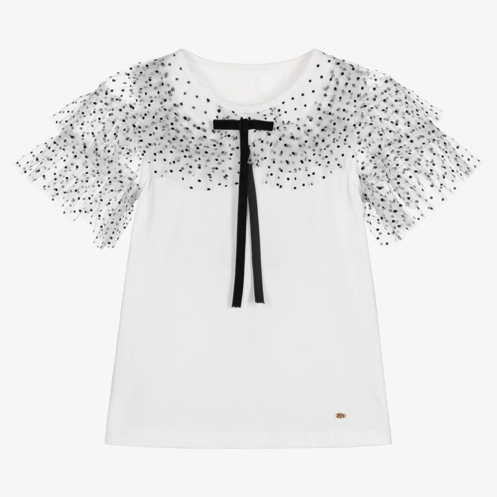 Lovely white T-shirt for girls from Junona, with fun black polka dot embellished tonal tulle frills on the sleeves and collar. Made in soft, cotton jersey it is easy to wear and has a black velvet bow on the front for a sophisticated finish.