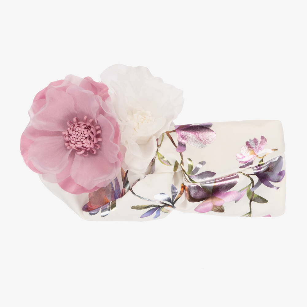 Exclusive to Childrensalon, a white headband for girls by Junona, made in smooth sateen. Patterned with a shiny lilac purple and green floral print, it has pretty white and lilac purple floral appliqués on the side. The back is elasticated for a comfortable fit and there is a gold metal logo charm on one side.