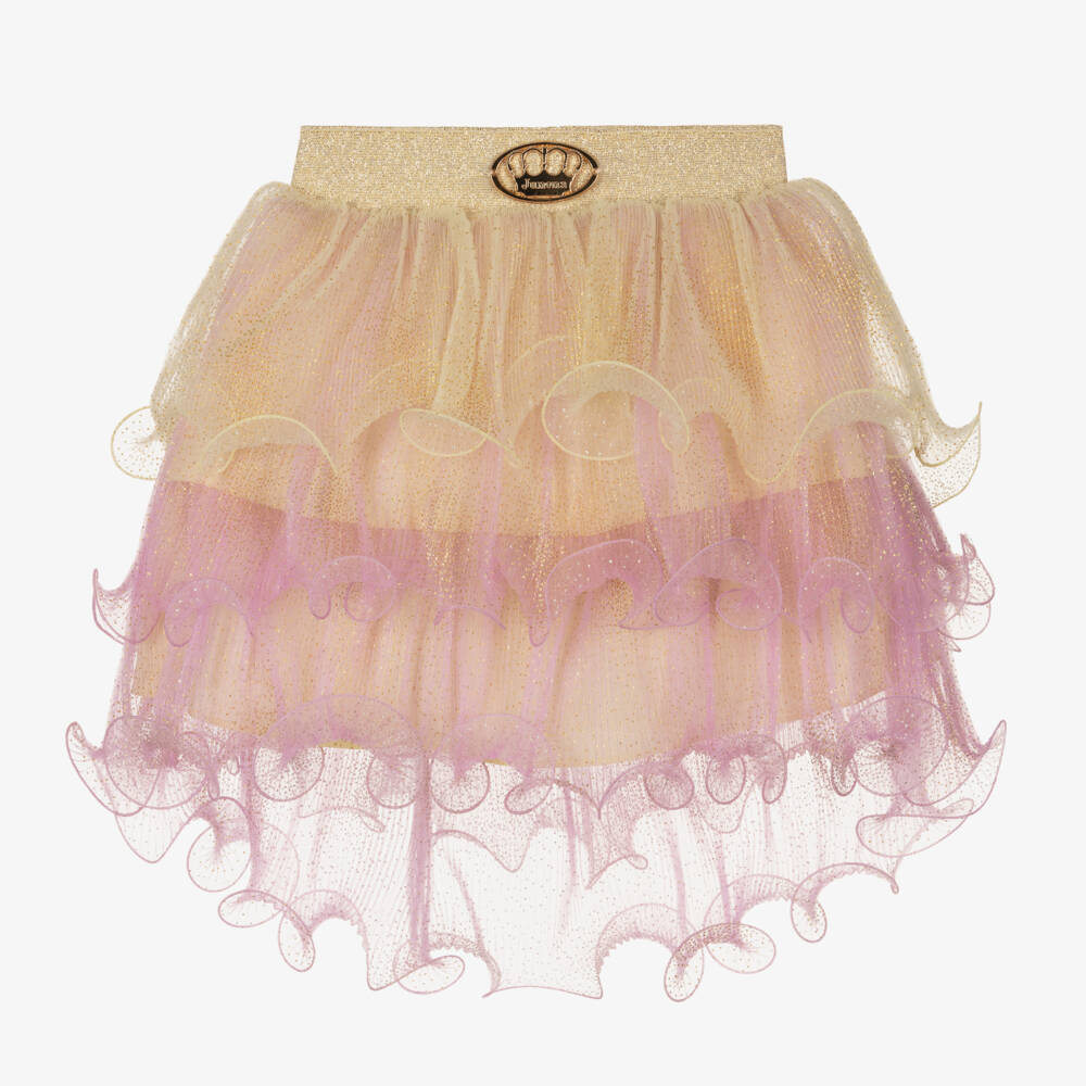 Irresistible curled tulle ruffles in pastel yellow and delicate lilac purple create a stunning Junona skirt for girls. Lovely for a special occasion, the tiered plissé layers are patterned with gold and silver dots for added sparkle and fall longer at the back. An easy-to-wear style, it has an elasticated gold glitter waistband with the brand's signature gold metal logo plate on the front, and is lined in comfortable lightweight cotton.