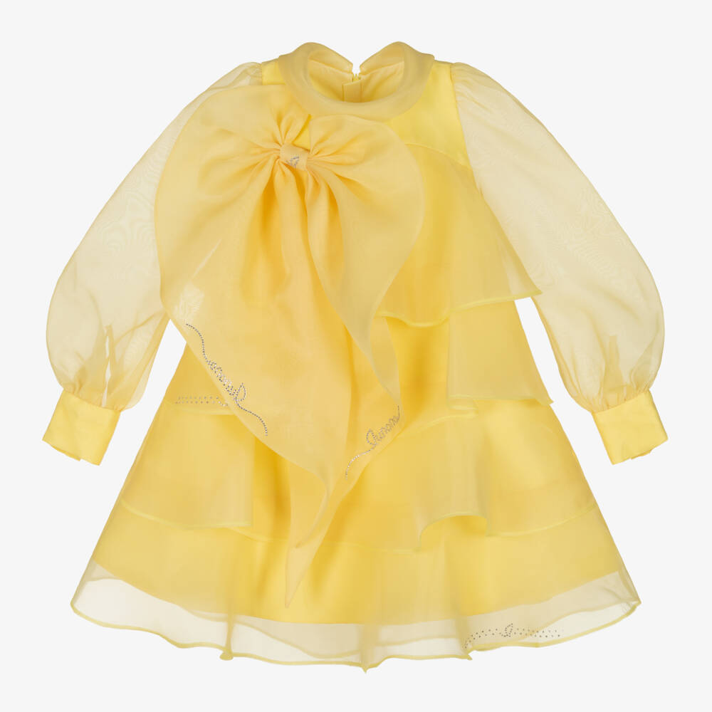 A beautiful yellow organza dress for girls by Junona. For a dramatic special occasion look, the front has a stand-out tiered detail with an oversized bow on one side, accentuated with sparkly diamanté logo scripts. The sheer puffed sleeves and pretty cowl neck give this dress a feminine and romantic silhouette. It is lined in soft cotton voile for added comfort and fastening with an invisible zip on the back for a neat finish.