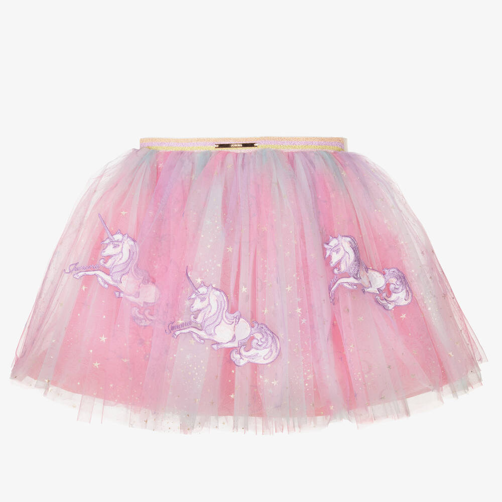 Pretty pink, purple and green ombré skirt for girls by Junona, made in layers of lightweight tulle. Sparkling with golden stars, it is printed with constellations, moons and eyes and has large unicorn appliqués all around. It has a glittery, striped, elasticated waist with a gold metal logo plate sewn on the front and a cotton lining for comfort. Easy to wear, it simply pulls on.