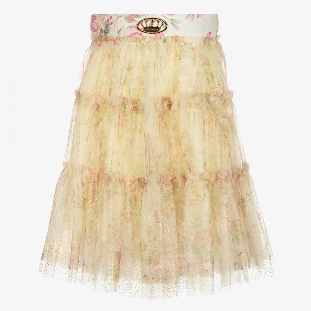 Lovely yellow special occasion skirt for girls by Junona, made in lightweight tiers of tulle. The top layer of tulle has a pink and green rose print, sparkling with little gold dots. Fully lined in yellow cotton voile, it has a comfortable, elasticated waistband with a gold logo crest sewn on the front.