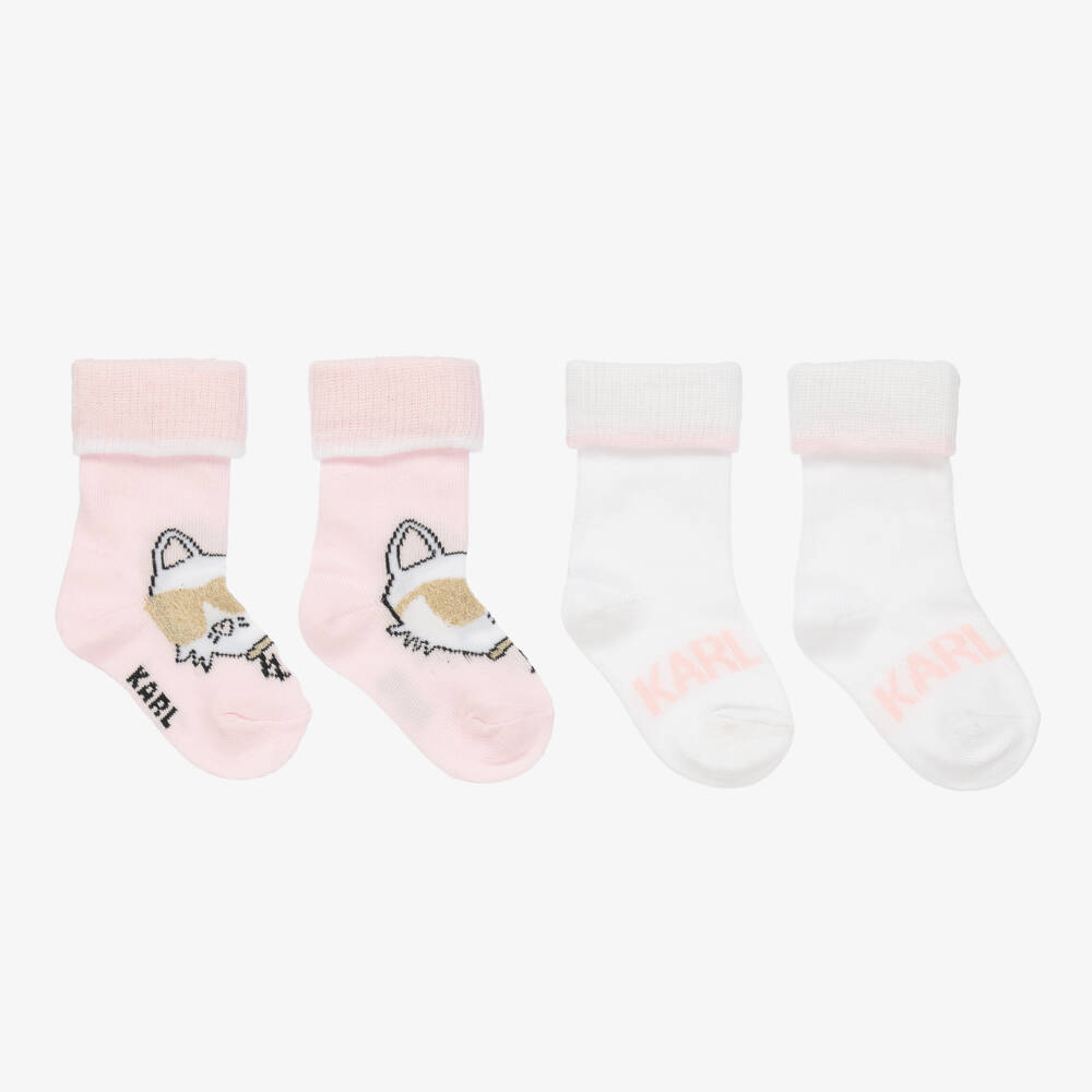 Cute set of two pairs of socks for baby girls by KARL LAGERFELD KIDS. Knitted in soft cotton, one pair is light pink with a sparkly gold Choupette motif and the other pair is white, with a light pink KARL design.