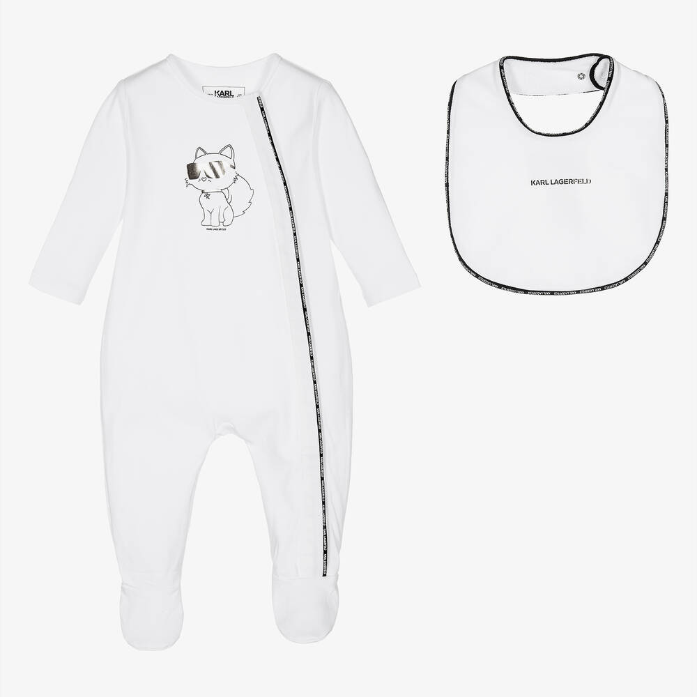 White cotton babygrow set for girls unmistakably by KARL LAGERFELD KIDS. It has Karl's cat Choupette on the front, inspired by the NFT KARL LAGERFELD Collection and looking cool and chic wearing shiny gold sunglasses. Made in comfortable jersey, the babygrow has useful popper fastenings on one side with a black and white logo trim. It comes with a matching bib that has a shiny gold logo on the front, adjustable popper fastenings around the back and an absorbent towelling lining.