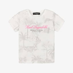 Ivory and black cotton T-shirt for boys by KARL LAGERFELD KIDS, patterned all over with the brand's monogram logo in contrasting shades. Inspired by the adult collection, it is made in comfortable jersey and styled with a casual crew neckline. A rubberised logo patch can be seen on the chest to complete the stylish designer look.