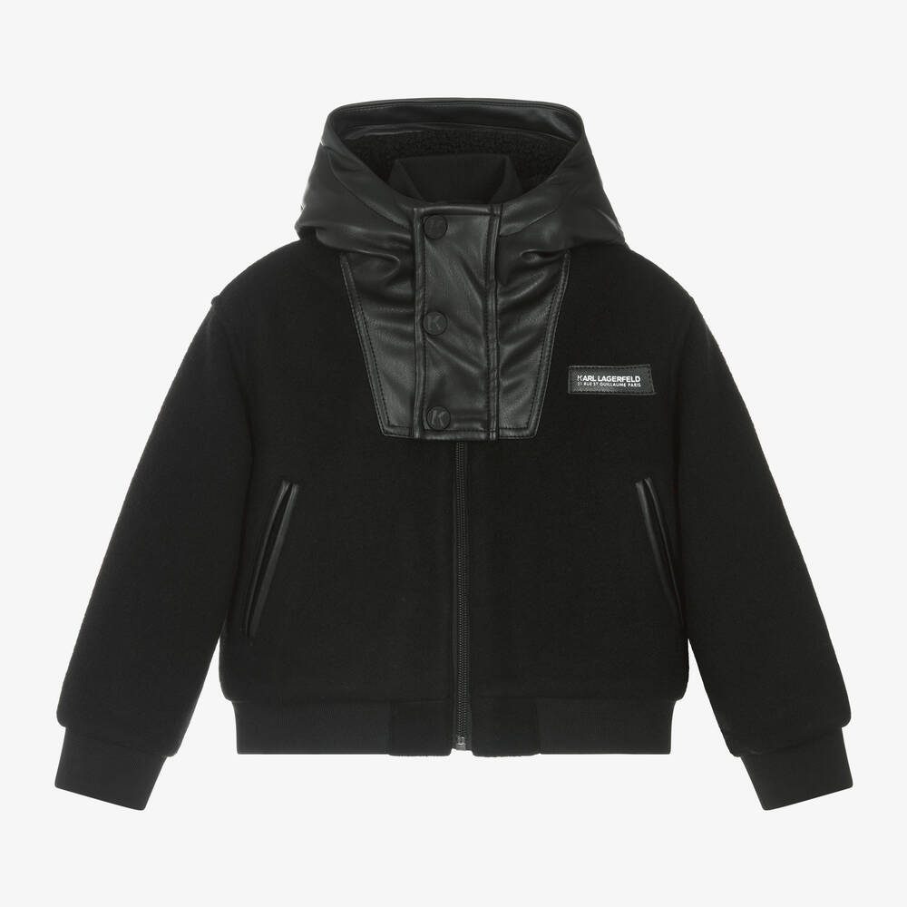 Black hooded jacket for boys by KARL LAGERFELD KIDS, made in a felted wool blend. A branded zip fastening on the front ensures quick dressing and keeps the warmth in. The hood is faux leather which extends onto a panel on the front with tonal Karl Kameo logo popper fastenings. Thick, soft fleece inside and ribbed cuffs add to the comfort of this stylish item.